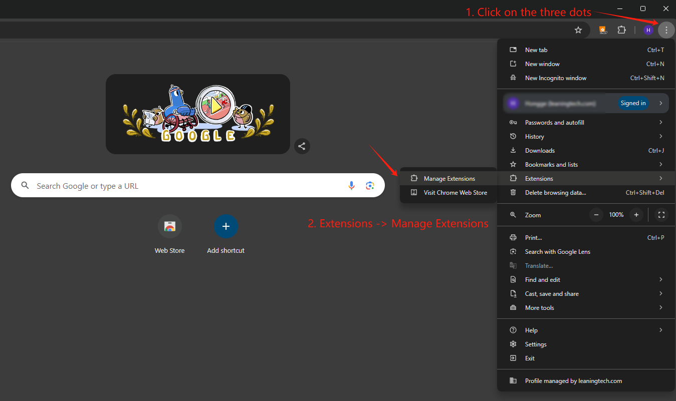 Let’s now access the Chrome extensions settings by clicking the three dots in the upper-right corner of the Chrome browser, going to Extensions and then selecting Manage Extensions.