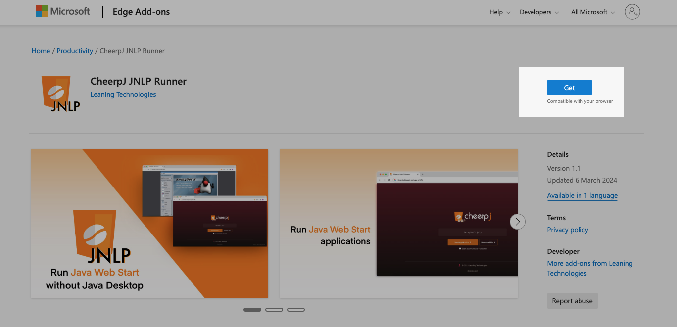 Please start by visiting the Edge’s add-on JNLP Runner page. Once there, please click on the button Get to start the installation.
